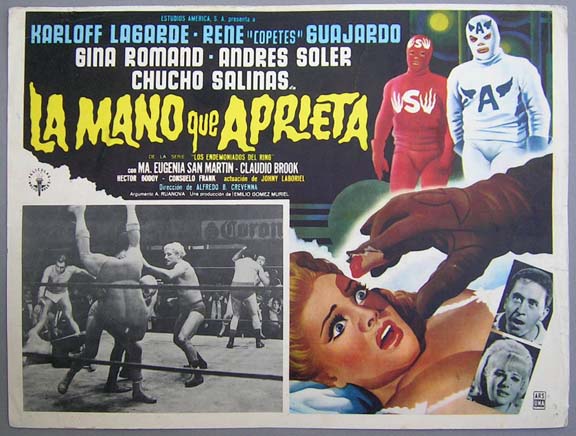 Rare horror film lobby card has excellent, atmospheric border graphics! This classic Frankenstein / masked wrestler / lucha libre film is one of the greats -- voted by Mexican critics as one of the two best Mexican horror films ever produced. The card has average signs of handling -- pinholes, edge wear, mild soiling -- but the colors are bright and there are no major flaws... This movie starred Columbia Dominguez, Crox Alvarado, Wolf Ruvinskis and Carlos Riquelme. $25 each |