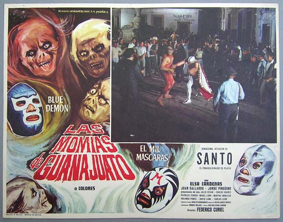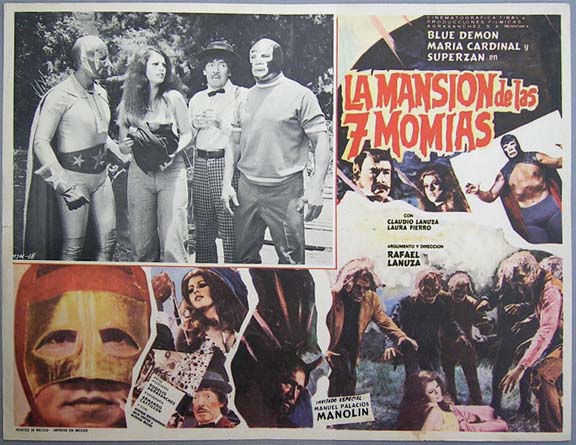 Interesting horror / lucha libre film lobby card has a great photo-montage -- picturing wrestling stars Blue Demon and Superzan, plus lots of hideous mummies. Light wear -- no major flaws... This movie starred Blue Demon, Superzan, Maria Cardinal, Claudio Lanuza and Laura Fierro. $15 each |