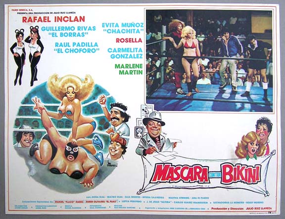 Bizarre lucha libre / comedy film lobby card pictures some scantily-clad female wrestlers, and more. The glossy card has a color inset-scene. The card has light to moderate signs of use, but no major flaws... This movie starred Rafael Inclan, Manuel Ibanez, Guillermo Rivas, Evita Munoz and Raul Padilla. $15 each |