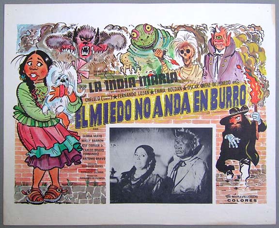 Fun comedy / horror lobby card (11x14") finds 'La India Maria' (Velasco) and her puppy stuck in a haunted house. The other residents of the house are also pictured on the card -- a cyclops, a toad-monster, a werewolf and other creatures. This movie starred Maria Elena Velasco, Eleazar Garcia, Wally Barron, Fernando Lujan and Oscar Ortiz de Pinedo. $15 each |