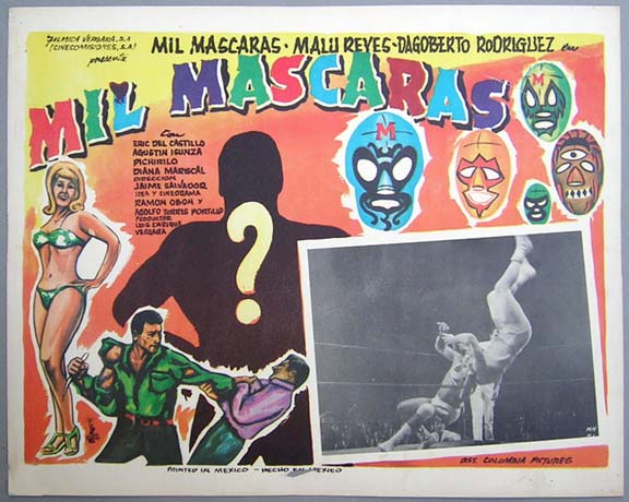 Colorful lucha libre film lobby card pictures a number of the masks worn by heroic mystery man, Mil Mascaras. For good measure, a sexy bikini babe is also shown. First film in the Mil Mascaras series . This card has no border art, just a color-scene covering the entire card surface. Light wear -- no major flaws... This movie starred Mil Mascaras, Malu Reyes, Dagoberto Rodriguez, Eric del Castillo and Fernando Oses. $15 each |