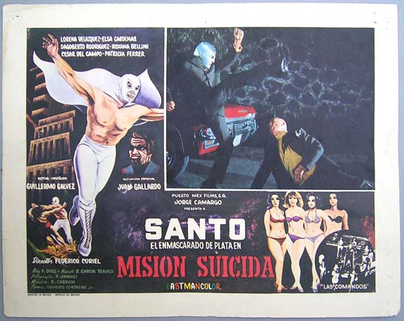 Attractive lucha libre film lobby card features nice images of Santo and several bikini-clad assassins. The card has light to moderate signs of use, but no major flaws... This movie starred El Santo, Lorena Velazquez, Elsa Cardenas, Guillermo Galvez and Juan Gallardo. $15 each |