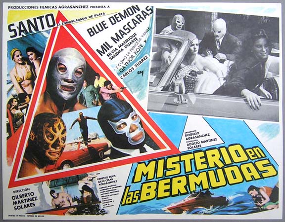 Colorful lucha libre film lobby card features a nice montage of images, including portraits of the three wrestling superstars: Santo, Blue Demon and Mil Mascaras. This was the trio's second (and last) film together... This movie starred El Santo, Blue Demon, Mil Mascaras, Silvia Manrique and Sandra Duarte. $15 each |