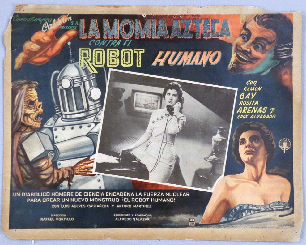 Gorgeous horror / sci-fi film lobby card from the final installment of the Momia Azteca series. the gorgeous artwork -- similar to the desirable onesheet -- pictures the climactic battle between the robot and the mummy. The card has average signs of handling -- pinholes, border chips, edge wear, browning -- but if matted and framed, the cards will still display beautifully... This movie starred Ramon Gay, Rosita Arenas, Crox Alvarado, Luis Acevez, Arturo Martinez and Lobo Negro. $35 |