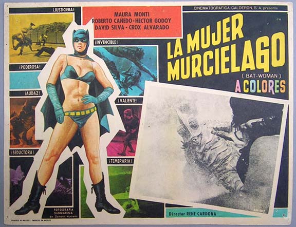 Dazzling sci-fi / lucha libre / horror film lobby card features gorgeous border art picturing Batwoman -- a shapely, bikini wearing, wrestling woman -- plus a Creature from the Black Lagoon like monster. The card has moderate signs of use, pinholes - etc., but no major flaws... This movie starred Maura Monti, Roberto Canedo, Hector Godoy, David Silva and Crox Alvarado. $35 each |