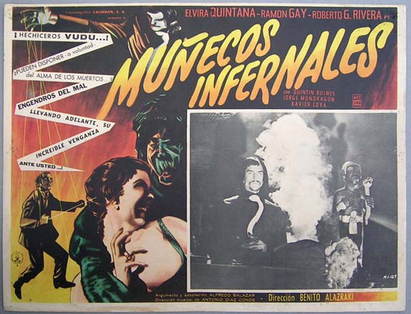 Striking Mexi-monster film lobby card features stylish horror graphics -- including murderous midgets in doll costumes and an ugly zombie. The film contains real nightmare material for kids, especially those creepy dolls. The card has average signs of handling -- pinholes, edge wear, mild soiling -- but there are no major flaws... This movie starred Elvira Quintana, Ramon Gay, Roberto Rivera, Quintin Bulnes and Xavier Loya. $20 each |