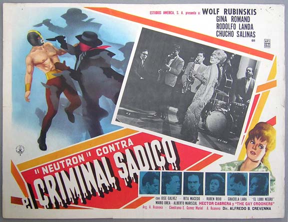 Artistic lucha libre / horror film lobby card pictures the masked hero against a mysterious, shrouded killer. Neutron sports a new mask in this, his fourth outing. The card has moderate signs of use, but no major flaws... This movie starred Wolf Ruvinskis, Gina Romand, Rodolfo Landa, Chucho Salinas and Lobo Negro. $20 |