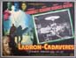 Great horror film lobby card (11x14") pictures a great image of Karloff working in his lab. This card has no border art, just a color-scene covering the entire card surface. The card has some very light surface spotting -- but otherwise, it is clean and bright... This movie starred Boris Karloff, Julissa, Carlos East, Rafael Bertrand, Yolanda Montes 'Tongolele' and Quintin Bulnes. $15 |