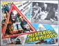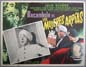 Magnificent horror film lobby card with an incredible color artwork depicting the gruesome Aztec mummy, some sci-fi gizmos, plus a sinister pair of hypnotic eyes. The B&W photo-scene features nice, atmospheric images... This movie starred Ramon Gay, Rosita Arenas, Crox Alvarado, Luis Aceves Castaneda, Arturo Martinez, Lobo Negro and Murcielago. $25 |