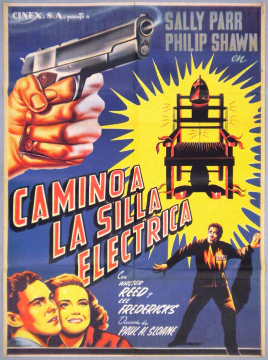 Wild looking Mexican movie poster from a well-regarded film noir. The artwork pictures a hand holding a gun, several cast members, plus an electric chair. The movie is also known as, The Sun Sets at Dawn... The film starred Sally Parr, Philip Shawn, Walter Reed and Lee Frederick. $55 |
