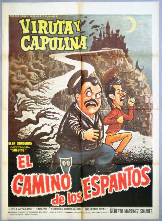 Great Viruta y Capulina Mexican comedy movie poster has great horror graphics -- including a haunted mansion and demonic trees... The film starred Marco Antonio Campos, Gaspar Henaine, Elsa Cardenas, Salome and Crox Alvarado. $85 |