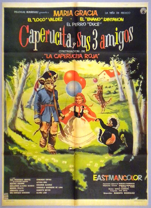 Colorful Mexican movie poster from a classic fantasy / family film. The colorful artwork pictures Little Red Riding hood walking along in the forest with her two pals, the Wolf and the Skunk. Charming!... The film starred Maria Gracia, Manuel 'Loco' Valdes, Santanon, Consuelo Guerrero de Luna and Prudencia Grifell. $150 |