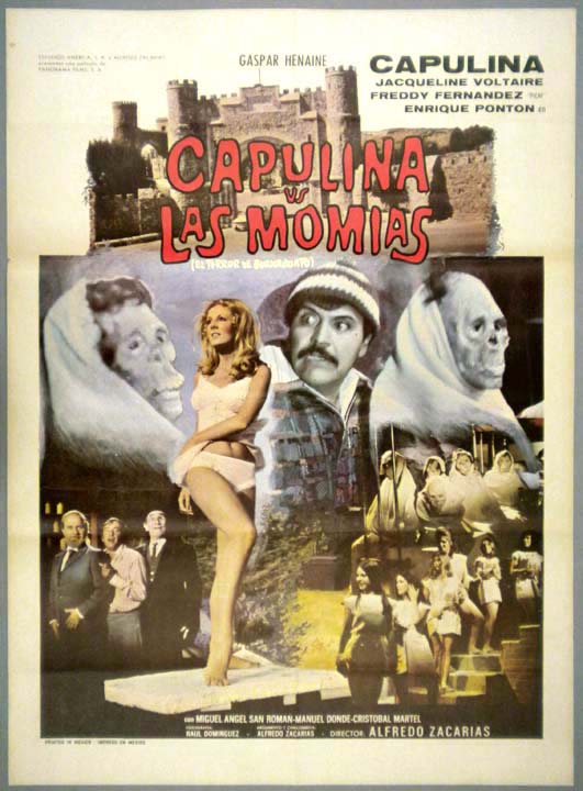 Nice Mexican comedy / horror movie poster features a montage of images from the film, including: some gruesome mummies, the sexy Ms. Voltaire and funny man Capulina... The film starred Gaspar 'Capulina' Henaine, Jacqueline Voltaire, Freddy Fernandez and Enrique Ponton. (This poster has only limited, very mild fold lines -- so it will be sent rolled.) $45 |
