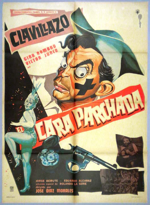A stylized close-up of comedian Clavillazo makes this Mexican comedy movie poster stand out -- plus there's a smaller image of a sexy showgirl! There is an area of discoloration near the upper right corner, but this affects the border area only -- it does not detract from the colorful artwork... The film starred Antonio Espino 'Clavillazo,' Gina Romand, Victor Junco and Yerye Beirute. $95 |