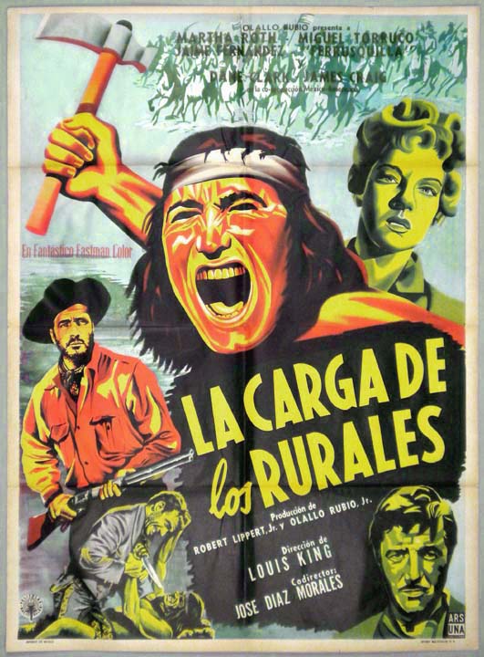Wonderful western graphics -- including a screaming Indian -- highlight this Mexican movie poster from a U.S./Mexican co-production... The film starred Martha Roth, James Craig, Dane Clark, Miguel Torruco and Jaime Fernandez. $55 |