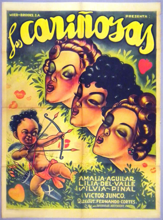Stunning Mexican comedy movie poster by Ernesto Garcia Cabral -- this one is even more vibrantly colored than usual. Cupid prepares to shoot three arrows at three lovely ladies: Aguilar, del Valle and Pinal. Gorgeous graphics -- and they appear on one of the scarcer Cabral onesheets! There is a small repaired hole on the dark right-eye area of the lowest of the three women, but this was extremely well done and is almost invisible. Otherwise, the colors are bright and the poster is in beautiful condition... The film starred Amalia Aguilar, Lilia del Valle, Silvia Pinal and Victor Junco. Sold |