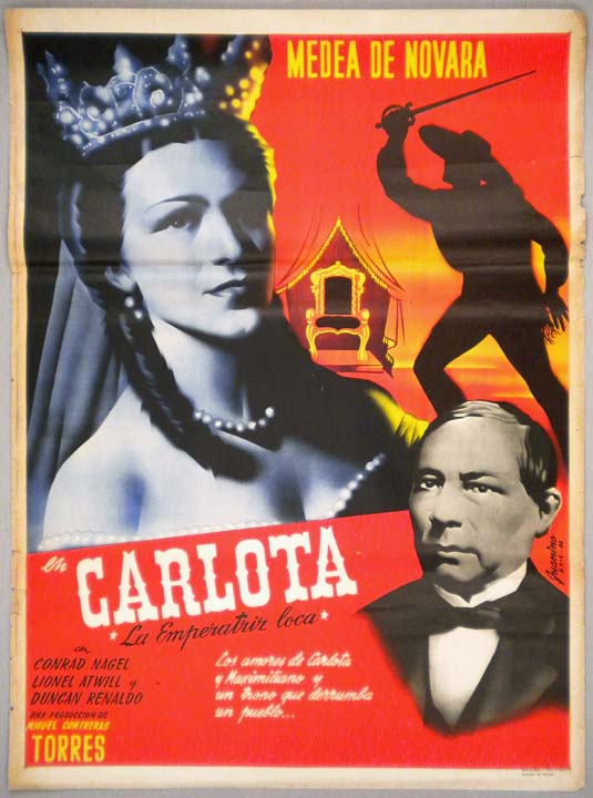 Colorful Mexican movie poster from this early historical drama, concerning Napoleon and the Empress Carlotta of Mexico. The poster features nice images of the main stars -- with a throne and swordsman in the background. There is some edge wear, plus a repaired tear near the upper right corner. But the colors are bright and it will display beautifully... The film starred Medea de Novara, Lionel Atwill, Conrad Nagel, and Guy Bates Post. (This poster has only limited, very mild fold lines -- so it will be sent rolled.) $75 |