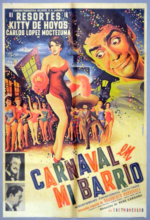 Colorful Mexican musical / comedy movie poster features a great shot of sexy showgirl, de Hoyos, plus a nice close-up of funny man, Resortes... The film starred Adalberto 'Resortes' Martinez, Kitty de Hoyos, Carlos Lopez Moctezuma, Dagoberto Rodriguez and Quintin Bulnes. $95 |