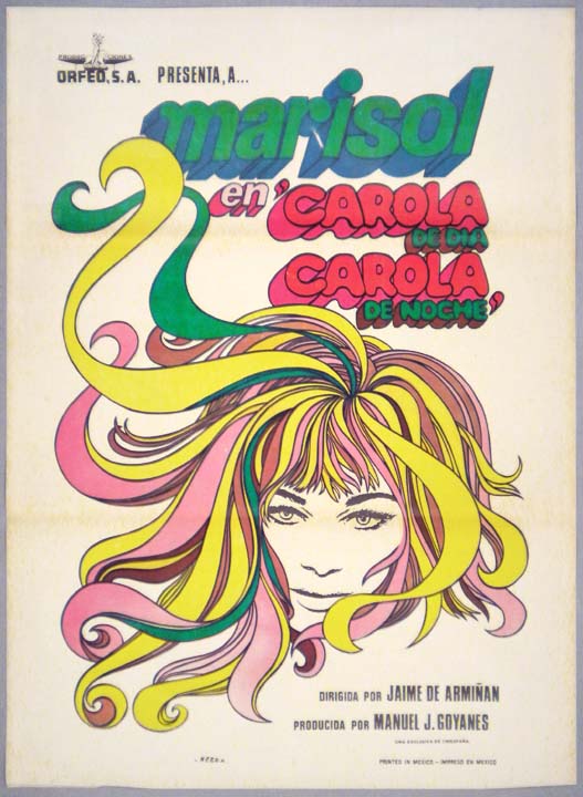 Colorful Mexican movie poster from a 1960s Spanish musical / fantasy film. The onesheet has a great psychedelic image of the three singer / star, Marisol. Slight edge wear, no major flaws... The film starred Marisol, Tony Isbert, Jose Sazatornil and Rafael Alonso. (This poster has only limited, very mild fold lines -- so it will be sent rolled.) $55 |