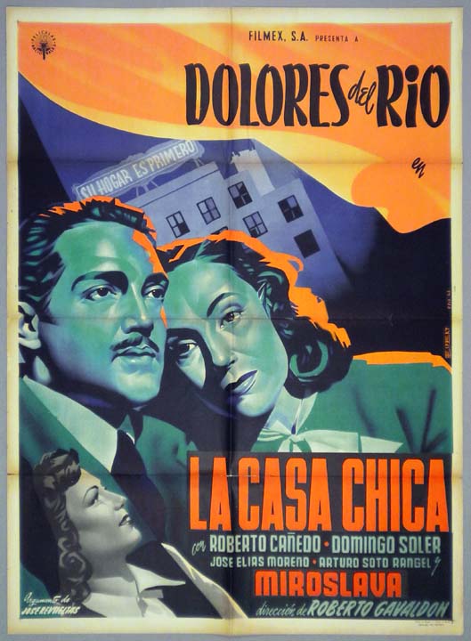 Vividly colored Mexican movie poster has a strong image of the two stars, with a surreal background. A beautiful onesheet. There is some light wear along the folds -- with one smallish piece of tape on the back reinforcing one section -- but these flaws are not too distracting. Otherwise, the colors are bright and the onesheet will display nicely... The film starred Dolores del Rio, Roberto Canedo, Miroslava, Domingo Soler, and Maria Douglas. $125 |