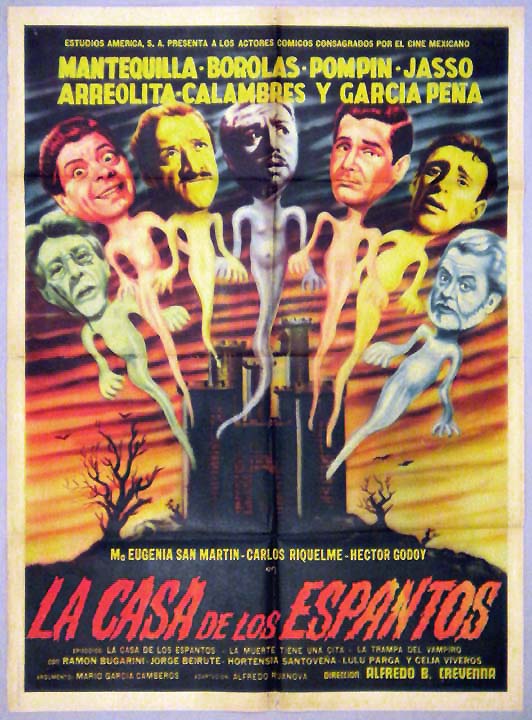 Memorable Mexican comedy / horror movie poster pictures the main cast members as ghosts -- all floating up from a haunted mansion. Beautiful colors and great design... The film starred Maria Eugenia San Martin, Carlos Riquelme, Hector Godoy, Ramon Bugarini, Yerye Beirute, Hortensia Santovena, Lulu Parga, Fernando 'Mantequilla' Soto and Joaquin Garcia Vargas 'Borolas.' $95 |