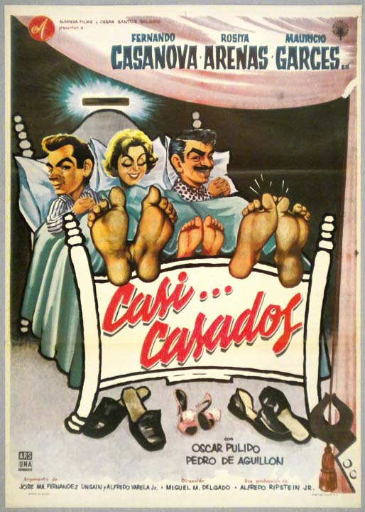 Cute Mexican comedy movie poster features a great caracature of the three main stars laying in bed together... The film starred Fernando Casanova, Rosita Arenas, Mauricio Garces, Oscar Pulido and Pedro de Aguillon. (This poster has only limited, very mild fold lines -- so it will be sent rolled.) $75 |