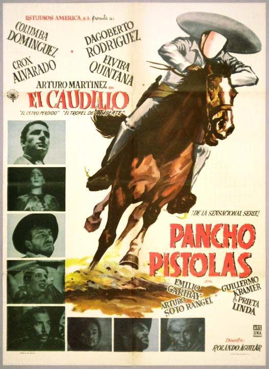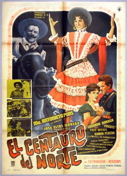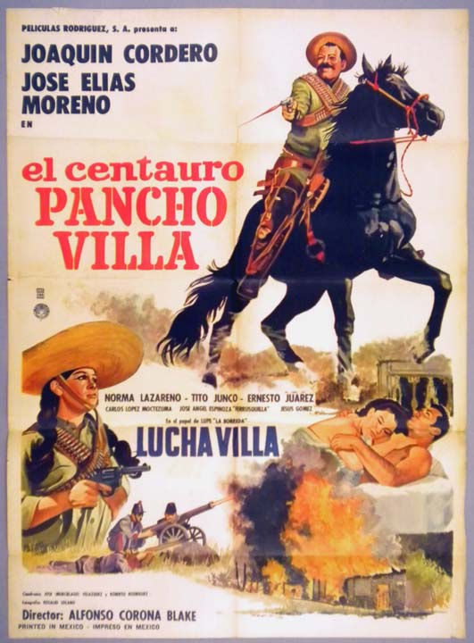 Colorful Mexican western movie poster has a great central image of Jose Elias Moreno, as the revolutionary general, Pancho Villa -- surrounded by a montage of movie scenes... The film starred Joaquin Cordero, Norma Lazareno, Carlos Lopez Moctezuma and Tito Junco. $65 |