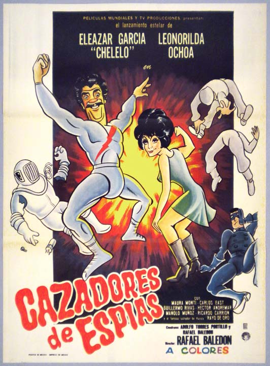 Colorful Mexican movie poster from a wild comedy / lucha libre / sci-fi / spy film. The plot features a robot, a man-eating plant, masked wrestlers, James Bond like antics and crazy rock 'n roll numbers... The film starred Eleanar 'Chelelo' Garcia and Leonorilda Ochoa, Maura Monti, Carlos East and Guillermo Rivas. (This poster has only limited, very mild fold lines -- so it will be sent rolled.) $55 |