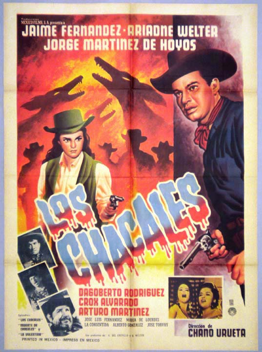 Fabulous Mexican western movie poster features great coloring, a nice shot of sexy cowgirl Welter, plus super shadowy background images of howling wolves... The film starred Jaime Fernandez, Ariadna Welter, Jorge Martinez de Hoyos, Dagoberto Rodriguez and Crox Alvarado. $75 |