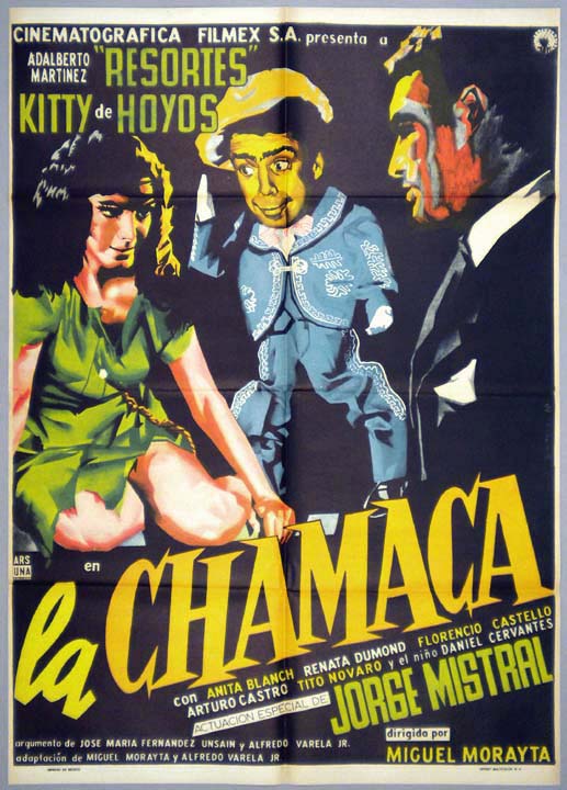 Stylish Mexican comedy movie poster, has a nice caricature of the musical / comedy star Resortes -- plus features a sexy image of a scantily clad Ms. de Hoyos... The film starred Adalberto 'Resortes' Martinez, Kitty de Hoyos, Anita Blanch, Renata Dumont and Jorge Mistral. $95 |