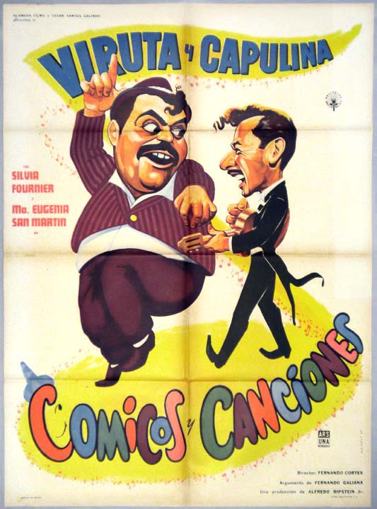 Great Viruta y Capulina Mexican comedy movie poster with a circus motif. It pictures Capulina as a clown and Viruta as a symphony conductor. Nice color! Light wear, no major problems... The film starred Marco Antonio 'Viruta' Campos, Gaspar 'Capulina' Henaine, Begona Palacios, and Enrique Rambal. $55 |