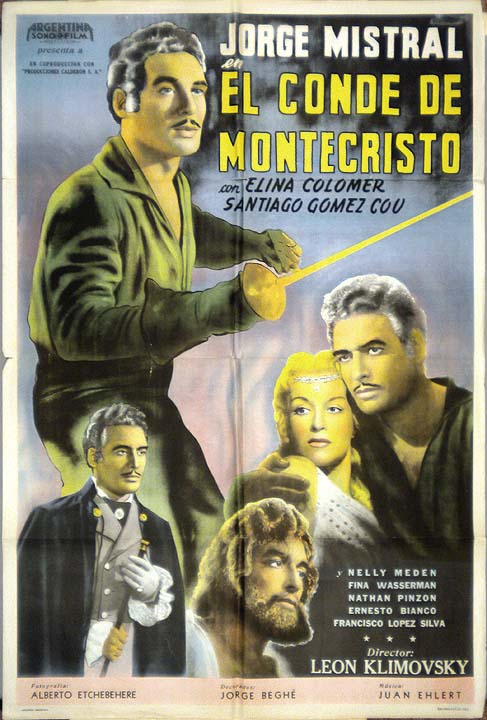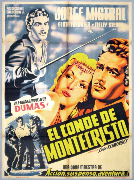 Colorful Argentine onesheet (29x43") from a classic film -- which was based on a novel by Alexandre Dumas. The movie poster features beautiful coloring and a great image of Mistral, as the Count... The film starred Jorge Mistral, Elina Colomer, Santiago Gomez Cou and Nelly Meden. $65 |