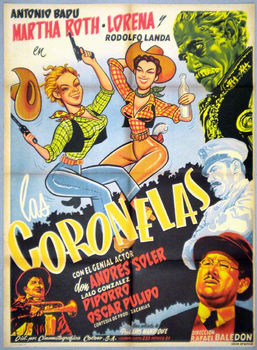 Colorful Mexican comedy / western movie poster shows two happy, attractive women -- each dressed in a cowgirl outfit... The film starred Martha Roth, Antonio Badu, Andres Soler, Rodolfo Landa, Oscar Pulido and Piporro. $195 |