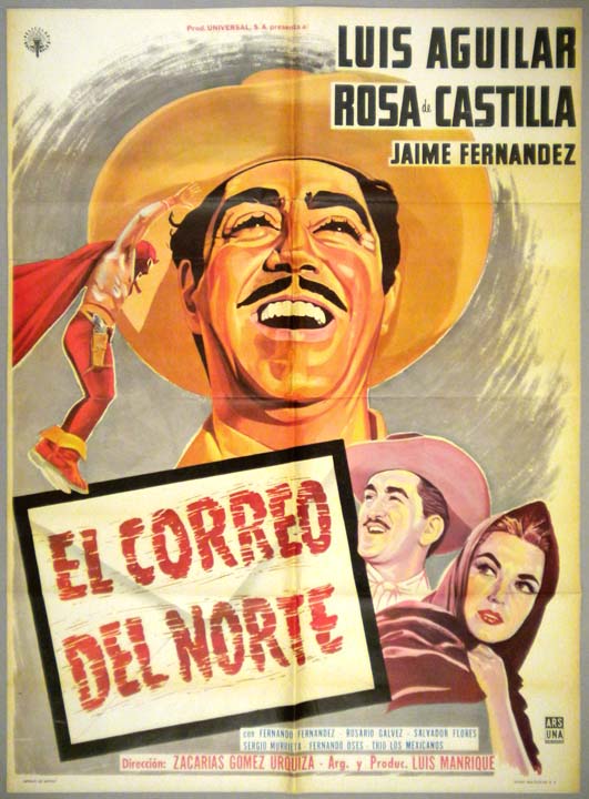 Classic Mexican western movie poster with a wonderful close-up of Aguilar, plus striking design. There is a repaired chip at the lower right corner, but this flaw does not affect the main image... The film starred Luis Aguilar, Consuelo Guerrero de Luna, Delia Magana and Agustin Isunza. $195 |