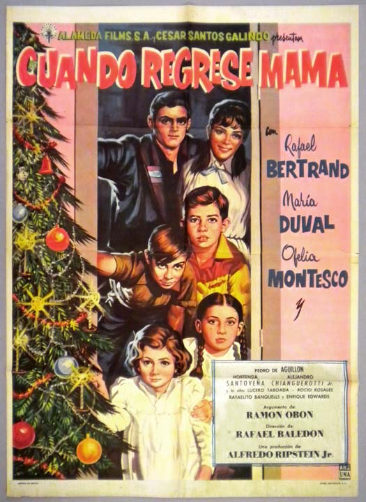 Nice heartwarming Mexican movie poster from this Christmas themed film. It pictures a family peeking out at the Xmas tree on Christmas morning. There is some light discoloration around the credits-box, near the lower right corner -- but this flaw is not very distracting. Otherwise, the colors are bright and the poster will display very well... The film starred Rafael Bertrand, Maria Duval, Ofelia Montesco and Pedro de Aguillon. $35 |