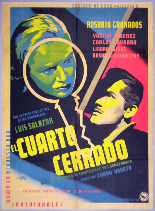 Compelling Mexican film noir / crime movie poster features striking graphics picturing the haunted Salazar and femme fatale Granados. Beautiful! There is some spotting along the top fold, but this flaw is not very distracting. Otherwise, the colors are bright and the onesheet looks great... The film starred Rosario Granados, Luis Salazar, Yadira Jimenez, Carlos Navarro and Linares-Rivas. (This poster was at one folded, but it has been stored flat for quite a while, so it will be sent rolled.) $195 |