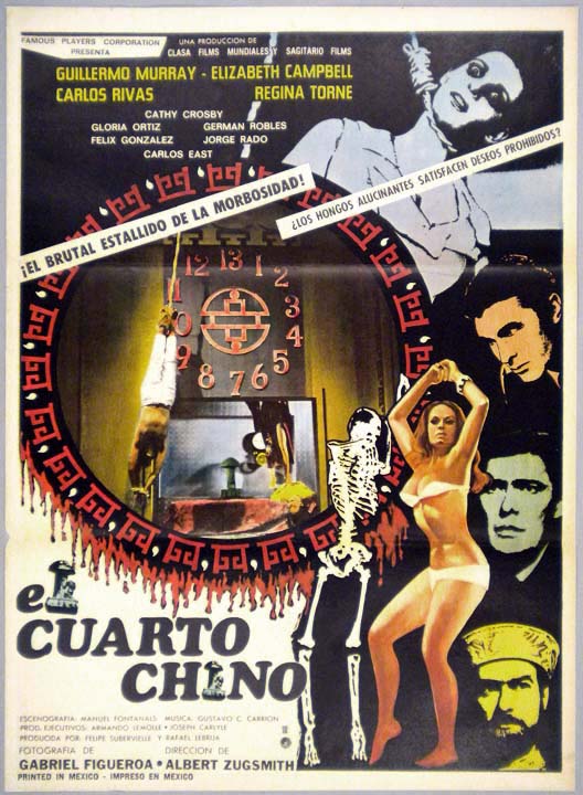 Striking Mexican movie poster from an off-the-wall, psychedelic horror / drug cult film. The onesheet features a montage of disturbing images, including a hanging woman and a human skeleton... The film starred Guillermo Murray, Elizabeth Campbell, Carlos Rivas, Regina Torne and German Robles. (This poster has only limited, very mild fold lines -- so it will be sent rolled.) $125 |