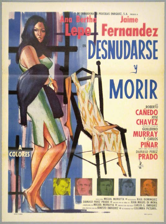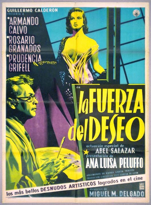 Stunning and sexy Mexican movie poster pictures an artist painting a portrait of the scantily-clad Ms. Peluffo. Beautiful! This was a historic film, in that it was the first of a series of 1950s movies to feature nudity... The film starred Armando Calvo, Rosario Granados, Prudencia Grifell, Abel Salazar and Ana Luisa Peluffo. $195 |