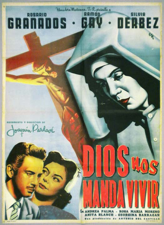 Attractive Mexican religious movie poster with a nice close-up image of Rosario Granados. The bottom vertical fold line has been reinforced on the back with a small piece of tape. This repair is not visible on the front of the poster, which is clean and bright... The film starred Rosario Granados, Ramon Gay, Silvia Derbez, Andrea Palma, Rosa Maria Moreno and Anita Blanch. $65 |