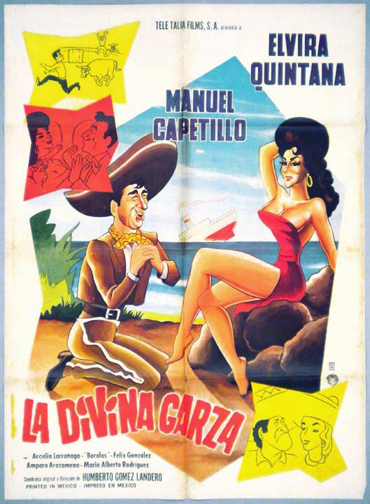 Beautiful Mexican comedy movie poster with vibrant colors and a striking image of the very sexy Ms. Quintana... The film starred Elvira Quintana, Manuel Capetillo, Joaquin Garcia Vargas 'Borolas' and Arcelia Larranaga. $65 |