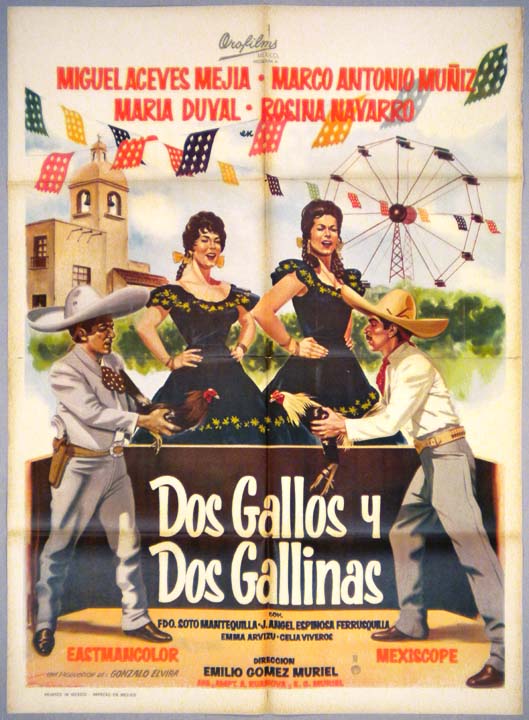Beautiful Mexican movie poster combines pretty senoritas, cockfighting, an amusement park and more... The film starred Miguel Aceves Mejia, Marco Antonio Muniz, Maria Duval and Rosina Navarro. $75 |