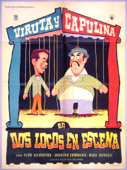 Memorable Viruta y Capulina Mexican comedy movie poster pictures the two funny men as marionettes in a puppet theater... The film starred Marco Antonio Campos 'Viruta,' Gaspar Henaine 'Capulina,' Flor Silvestre and Marina Camacho. $95 |