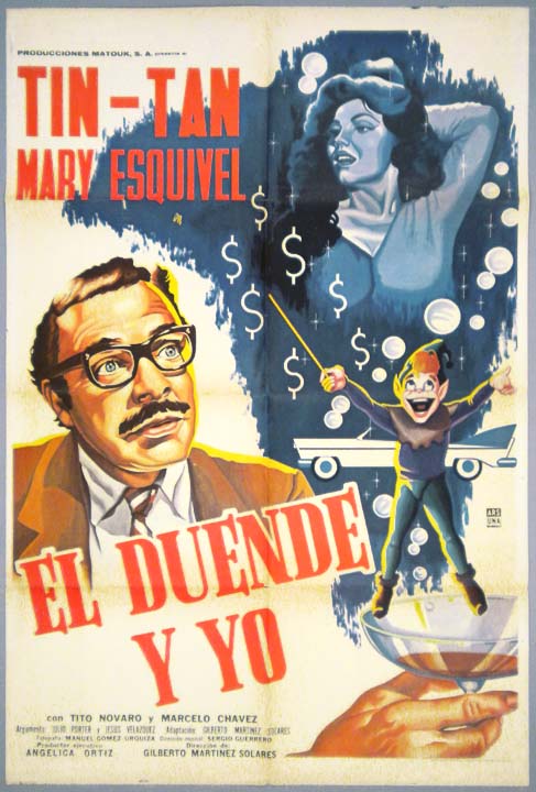 Comedy Mexican movie poster shows a mature looking Tin Tan -- with sexy woman in the background, plus a pixie appearing above his drink. (This onesheet measures 24x36")... The film starred German 'Tin Tan' Valdes, Mary Esquivel, Tito Novaro, Marcelo Chavez, Alica Montoya and Rafael Alcayde. $45 |