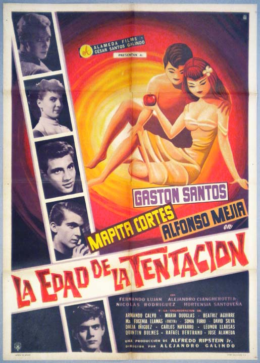 Attractive youth-oriented Mexican movie poster, is drawn in an unusual style. The colorful graphics picture a young couple as a modern Adam and Eve... The film starred Gaston Santos, Mapita Cortes, Alfonso Mejia and Fernando Lujan. $65 |