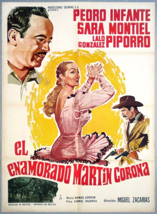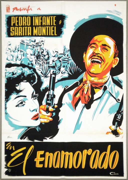 Classic Mexican western / ranchera movie poster features colorful images of Pedro Infante and Sara Montiel. The film was also released as, Enamorado. This poster is likely a 1960s re-issue of the film... The film starred Pedro Infante, Sara Montiel, Eulalio 'Piporro' Gonzalez and Armando Silvestre. $75 |