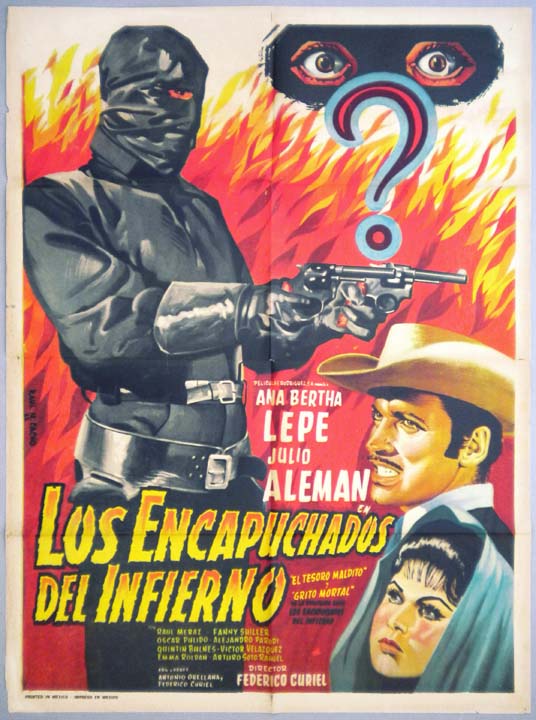 Attractive Mexican western / horror movie poster features mysterious eyes watching a masked horseman in action. Great color and design... The film starred Julio Aleman, Ana Bertha Lepe, Rene Cardona, Raul Meraz and Fanny Schiller. $125 |