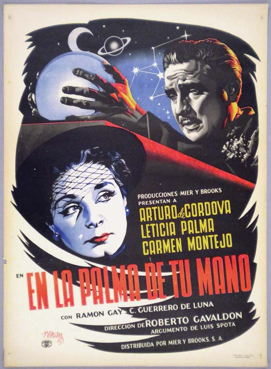 Stylish Mexican film noir movie poster has great color, nice close-ups of the main stars, plus a striking image of de Cordova holding a crystal ball. Beautiful!!!... The film starred Arturo de Cordova, Leticia Palma, Ramon Gay and Consuelo Guerrero de Luna. (Rolled) $225 |