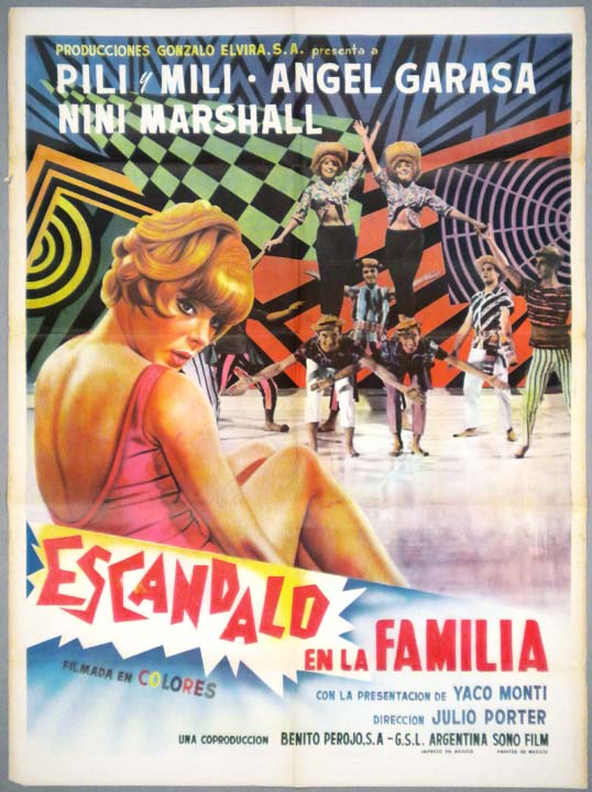 Colorful Mexican comedy movie poster combines a sexy image of Nini Marshall, the comic antics of Mili y Pili, and a psychedelic Rock 'n Roll motif... The film starred Nini Marshall, Pilar Bayona, Emilia Bayona, Angel Garasa and Yaco Monti. $55 |