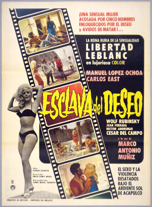 Unusual Mexican crime movie poster pictures the sexy Ms. Leblanc beside a large strip of film -- each frame showing a scene from the movie... The film starred Libertad Leblanc, Manuel Lopez Ochoa, Carlos East and Wolf Ruvinskis. (This poster has only limited, very mild fold lines -- so it will be sent rolled.) $75 |
