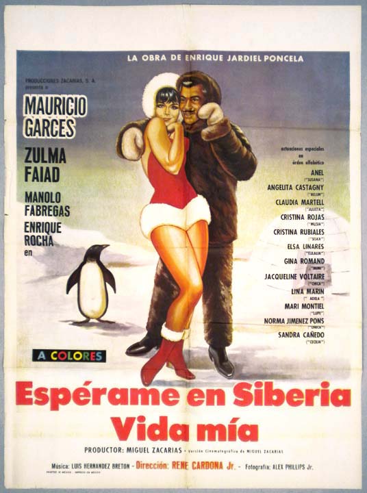 Attractive Mexican comedy movie poster has super artwork picturing Mauricio Garces snuggling with sexy snow bunny, Zulma Faiad -- with a curious penguin looking on... This movie starred Manuel Fabregas, Enrique Rocha, Gina Romand and Jacqueline Voltaire. $55 |